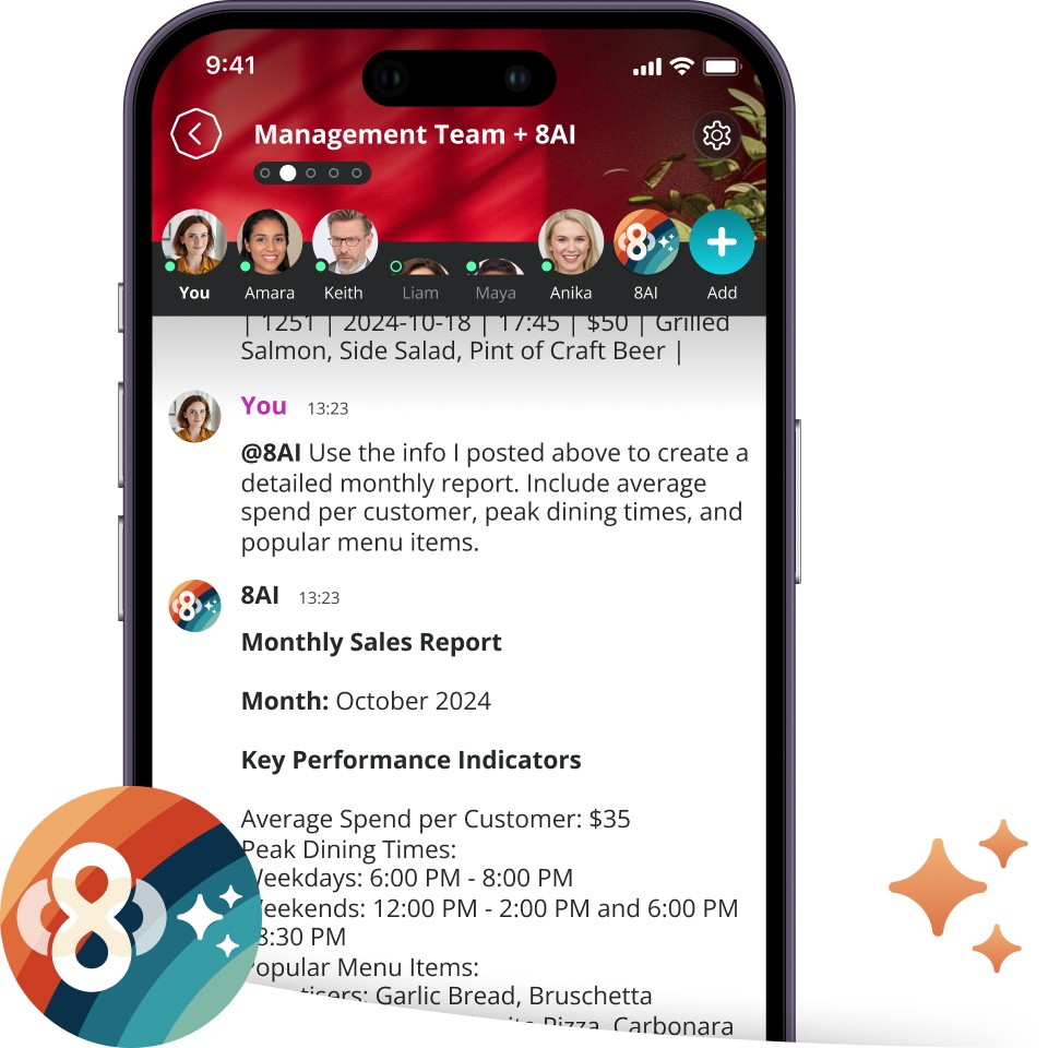 8AI is your newest intelligent Team Member, ready to assist with brainstorming, summarising conversations and conducting research in real time. Fully optional and privacy-focused, you can tap 8AI in or out of discussions to suit your needs—making collaboration smarter and more efficient.