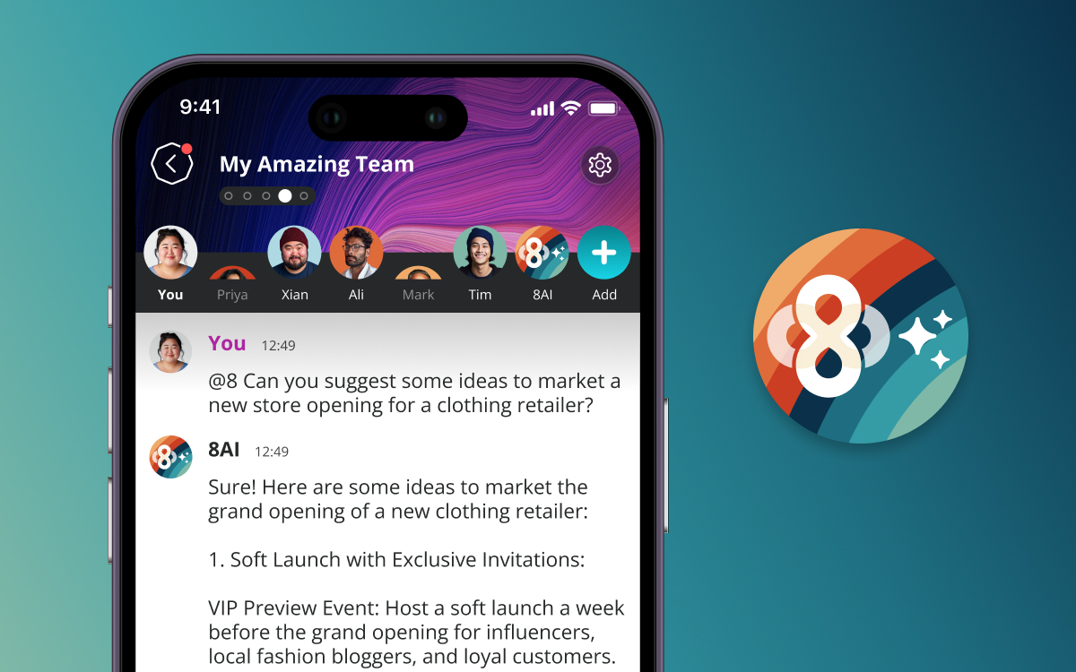 Add 8AI to your Tables and Rooms and chat to AI just like another member of your team. Simply type "@8" in a message and 8AI will respond to your prompt or message in the chat.