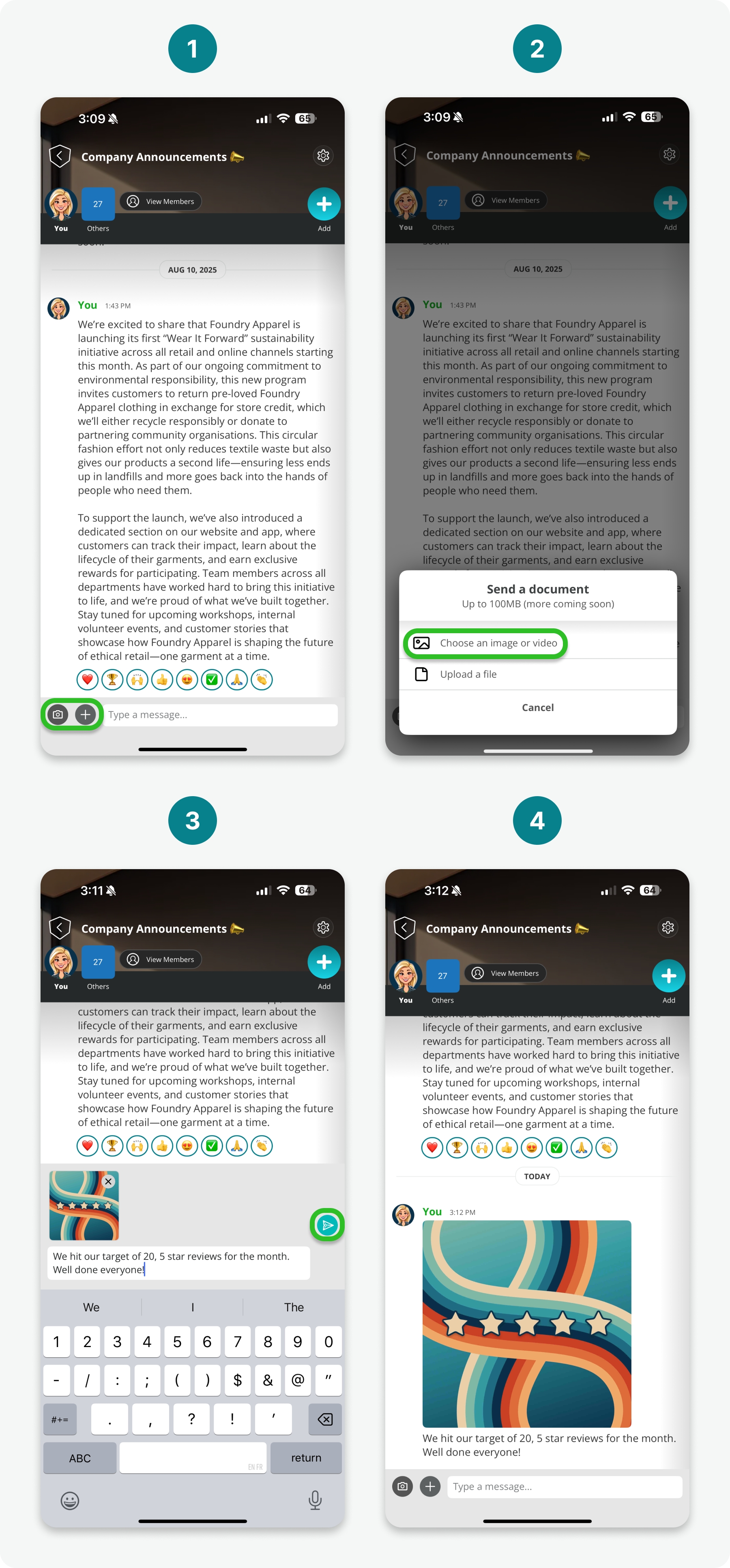 Your images and videos will appear with a preview in the composer bar. Simply click the arrow to instantly send or type a message to accompany your media uploads.