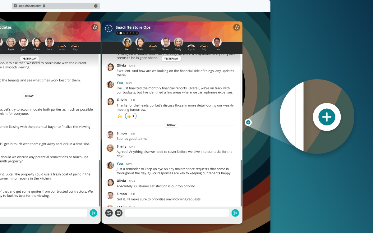 Enter power mode on desktop with multi-columns. On the web version of 8seats for desktop, you can open extra chat columns by clicking the + button on the right hand side. You can simultaneously view different conversations on the same Table, or different Tables, Rooms and DMs – a powerful boost to your workflow.