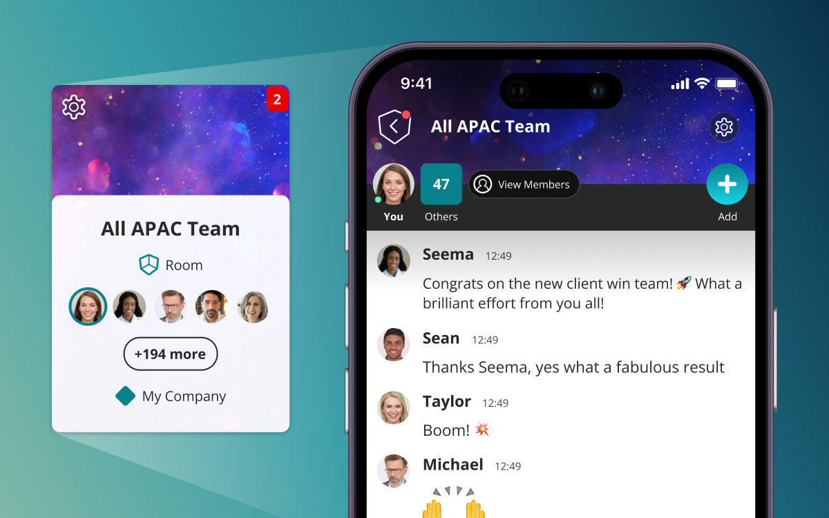 Choose a Room when you have a larger group of people. Did you know that a Room on 8seats can support up to 10,000 members? Rooms are a good choice for an all-team chat, company announcements, policies and procedures or a kudos and congratulations Room.